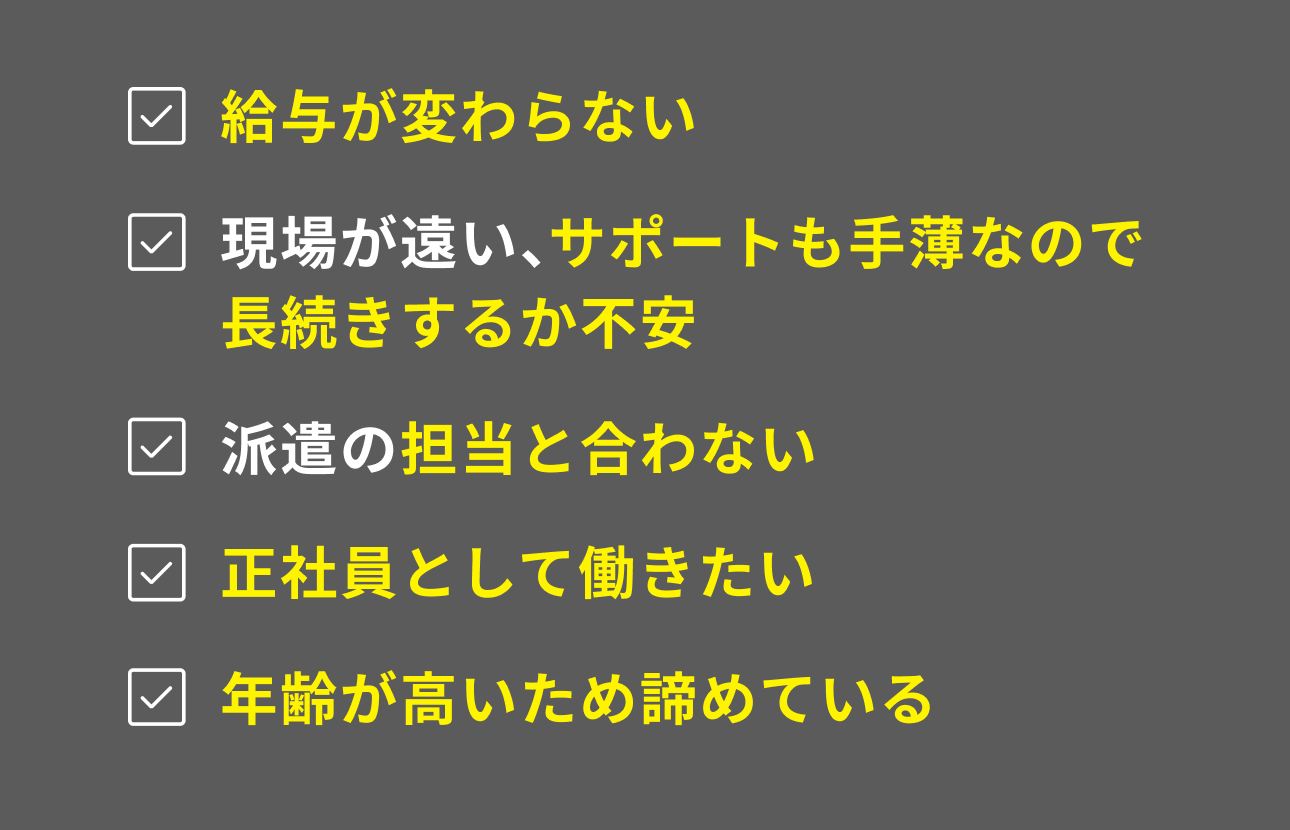 派遣法で特定行為は禁止事項になる為、同現場での就業継続は厳しいですが、いい解決案を一緒に模索したいと思いますので、気兼ねなくご相談ください。