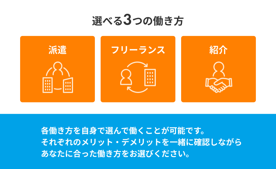 弊社の正社員や契約社員等で従事いただくほか、ご希望条件に合う他企業様があれば、そちらの正社員入社をご推薦させていただくことも可能です。幅広い可能性であなたの希望の働き方を実現いたします。